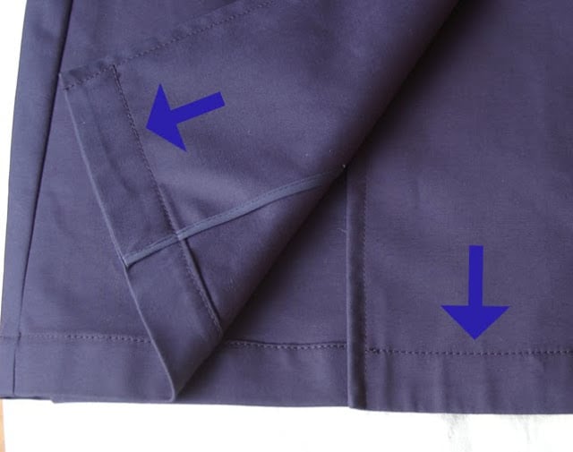 Here’s a trench coat I had shortened. Not only was it hemmed inches too short, but the hem was very sloppy! The thread tension was way too tight and pulled on the fabric. Also, on trench coats the bottom hem is usually a wide one (1 to 1.5 inches). Any good tailor would have redone this without being asked: