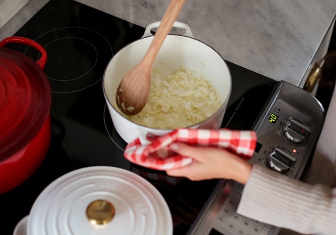 - Sauté the garlic and onions in a little olive oil over low-medium heat until the onions begin to soften.