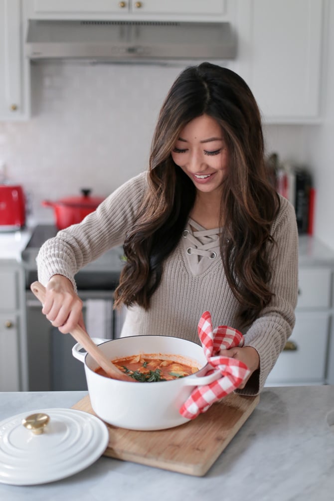 I’ve been getting recipe requests whenever I post cooking snaps, so would love to share more of our favorite dishes on here! Today’s one-pot recipe is super easy (even for beginners), using ingredients most of us already have at home. And it’s oh-so-satisfying to warm up with on a cold day. I was never a big fan of tomato soup growing up, but Nick and I can’t get enough of this one. The addition of tortellini makes it hearty enough for a full meal, and the usual fattier heavy cream was not missed. We make a little extra to freeze for quick weeknight dinners!