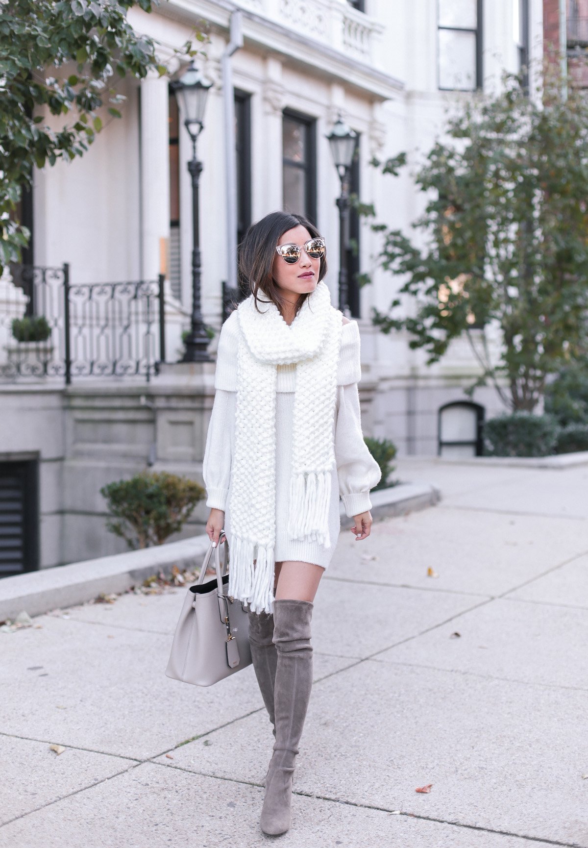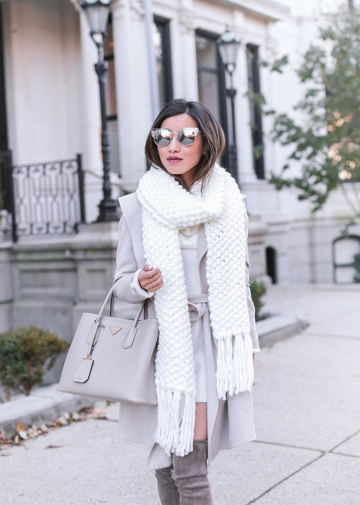 An off-the-shoulder white sweater-dress ideally matches this cable-knit scarf in white color. Like the way, you finished the look by adding OTk boots and cream grey handbag. Simple and chic. The mirrored sunglasses are fantastic!