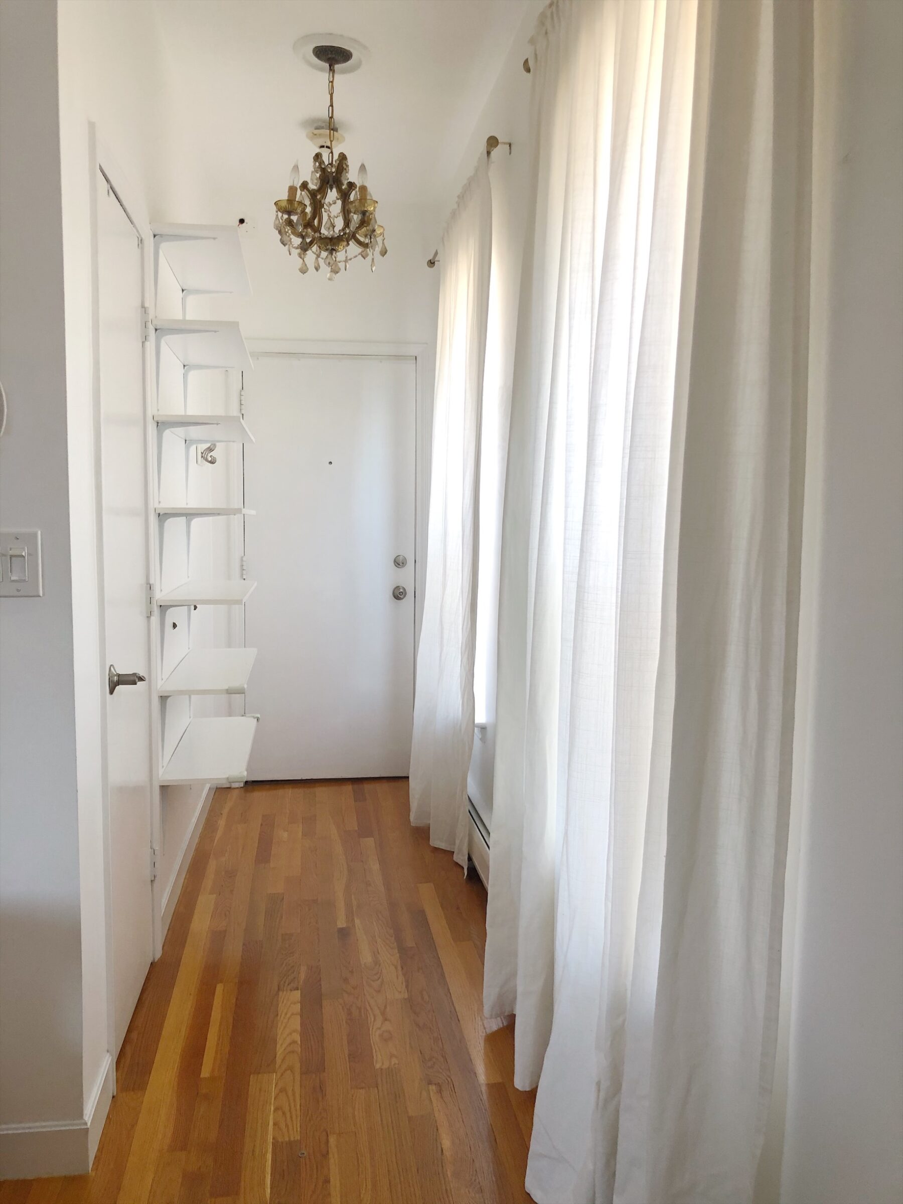 Added shoe shelves to entryway and floor to ceiling curtains: