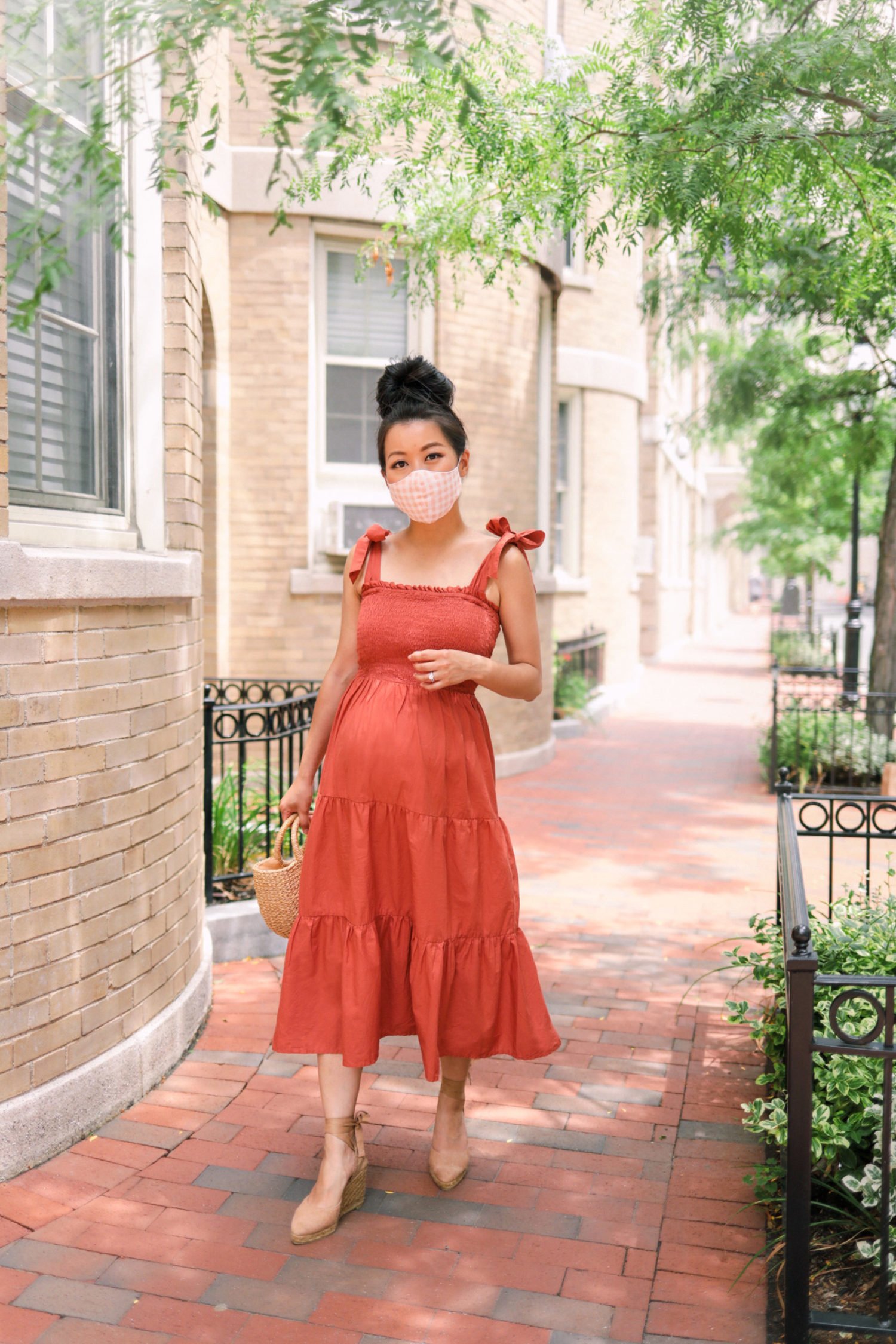I was drawn to the flirty tie shoulders (which functionally help a lot with fit, whether you’re petite or tall!) and the lovely rust color that will transition smoothly into Fall. The bodice is smocked all around, so is super stretchy and forgiving. Material is unlined 100% cotton with a cotton poplin fabric feel to it, and needed a steaming out of the package but has been fairly low maintenance after that!