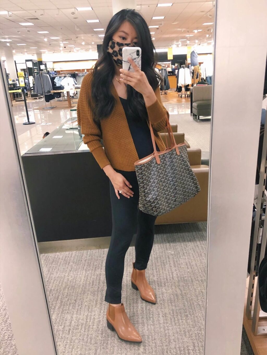 These are your super classic pointed bootie, with stable block heels and a sleek silhouette. These were a definite buy for me after trying them on, and I know they’ll be versatile with tights, jeans & pants alike. See them on me below with bare legs vs leggings.