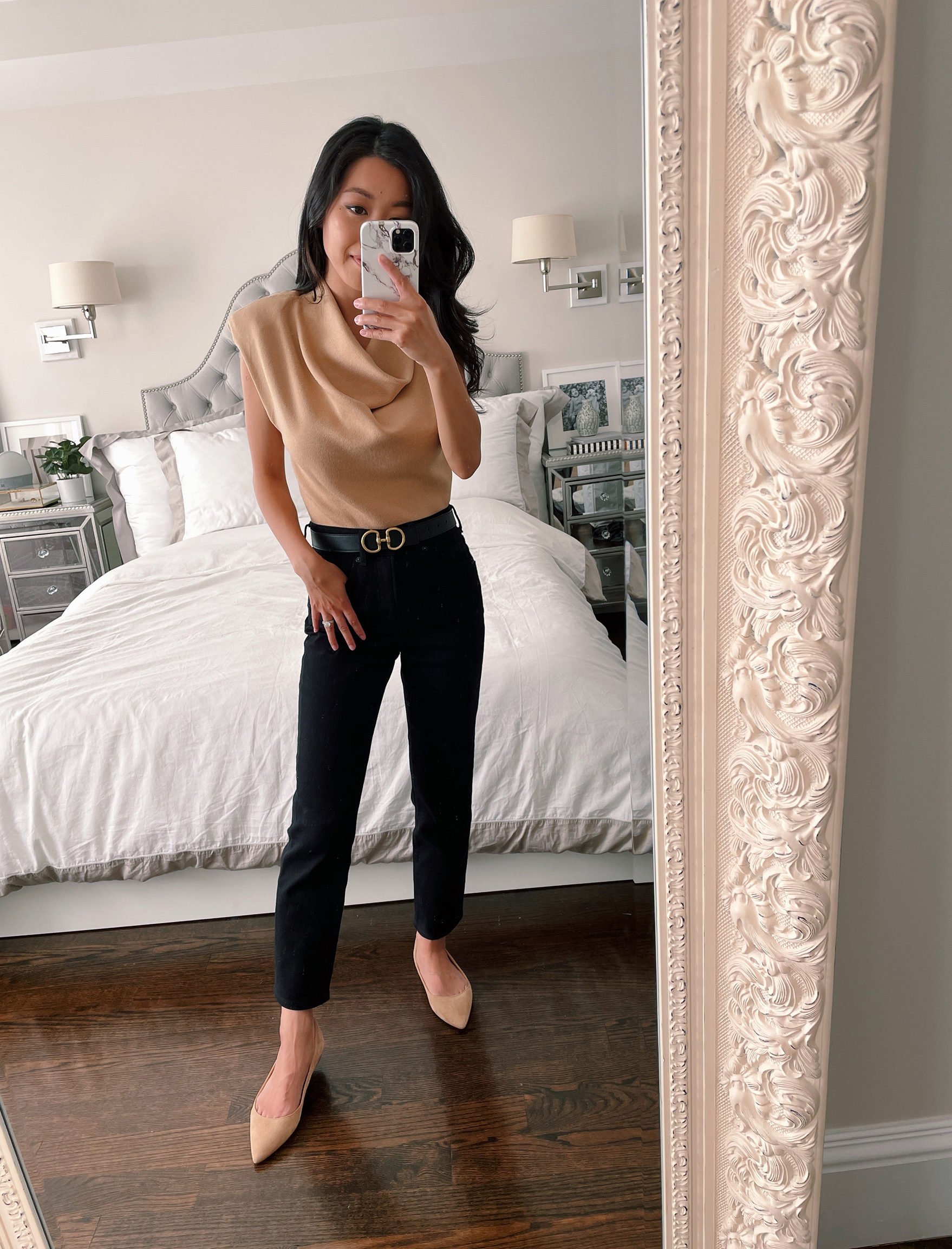 My practical outfit formula lately has been slim straight jeans, pointed flats, and a top with an interesting detail or draping! Above is how I’d wear this as a simple but chic everyday outfit, and then just swap in heels and a blazer / trench coat for a business or presentation-worthy look.