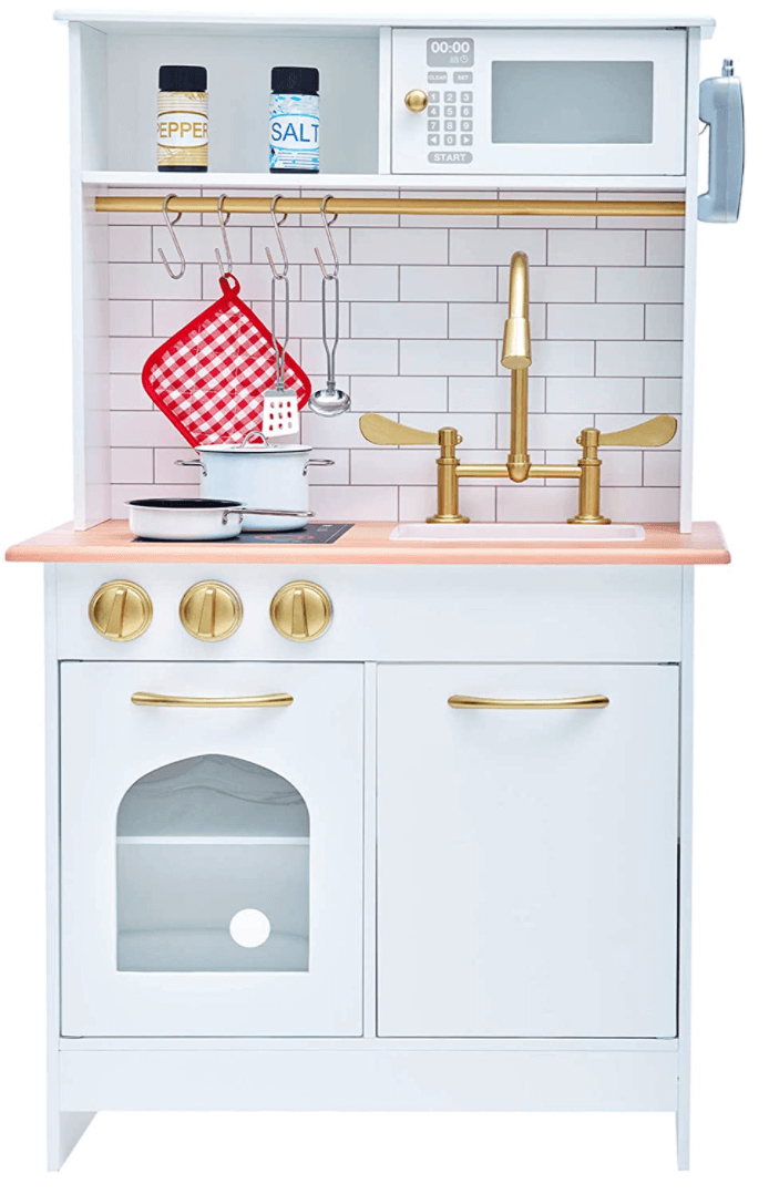 We love the value of our Teamson play kitchen, which gets daily play and doubles as a little toy hideaway cabinet. Our exact one, their “Boston” style is currently sold out, but they have several other cute options like the Berlin and this retro one. Teamson kitchens are also available at Walmart and Wayfair. As a note, you can give your play kitchen a little facelift with this simple DIY we used on ours.