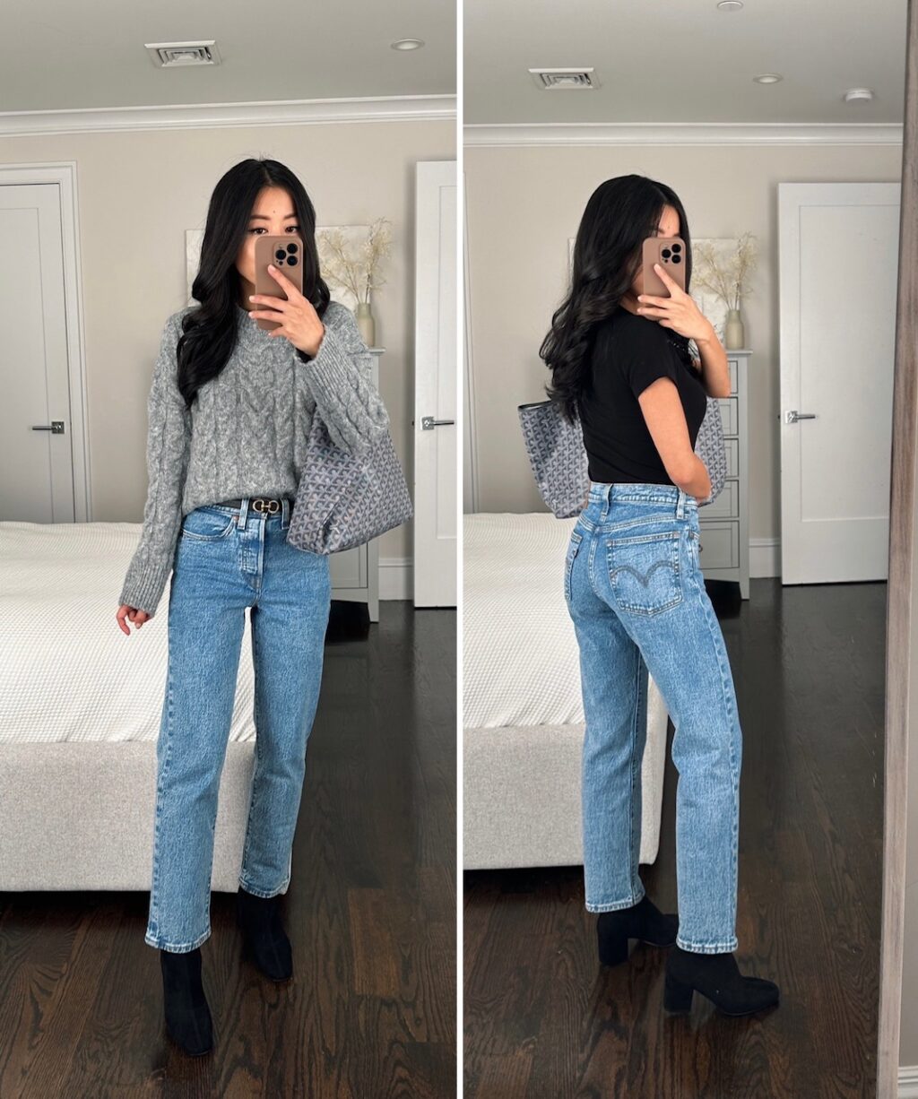 - Madewell perfect vintage jeans (see on me). The Madewell jeans are a little more tapered and narrower at the leg opening compared to the Levi’s. Because of this, the Madewell PVJ don’t always fit as well over an ankle boot. I also need to shorten or cut the hems of my Madewell PVJ, even in their petite sizing.