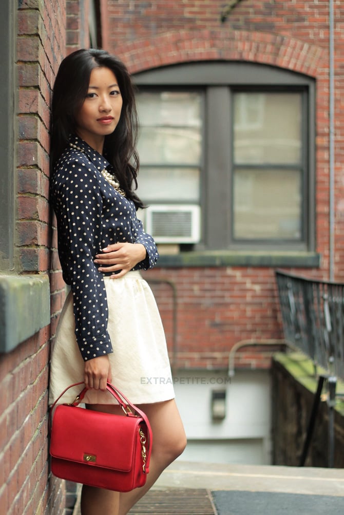 Navy Silk Dots Blouse + Wool Bell Mini Skirt